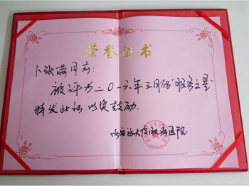 对于自己获得三月的“服务之星”,卜张蕊表示自己很惊喜也很感动,惊喜的是在全院这么多人里自己能够获得这份荣誉,感动的是非常感谢领导和同事对自己工作上的认可和肯定,自己今后会更加的努力,不辜负领导授予自己的这一份荣誉。